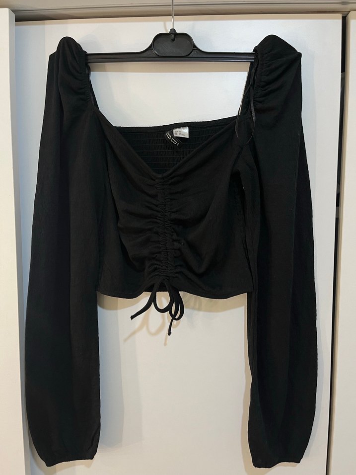 Drapeli ön kısmı ve ayarlanabilir büzgüsü ile uzun kollu, tek renk siyah mini bluz. Rahat sentetik kumaştan üretilmiştir.