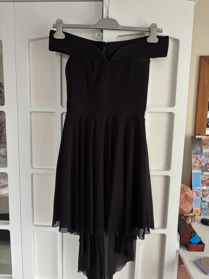 V yaka, drapeli ve askılı siyah mini elbise, gotik tarzda, romantik akşamlar için uygun, vücuda oturan kesime sahip.