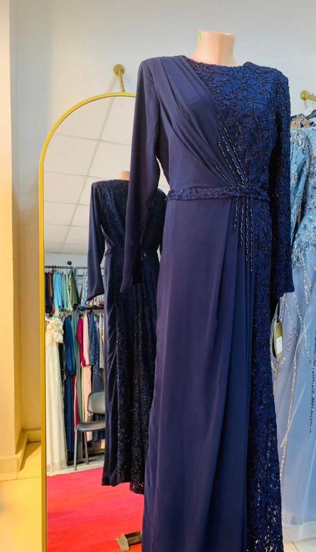 Siyah, bol kesim, uzun kollu, nakış detaylı uzun abiye elbise. Yuvarlak yaka ve drapeli tasarıma sahiptir, düğün için uygundur.
