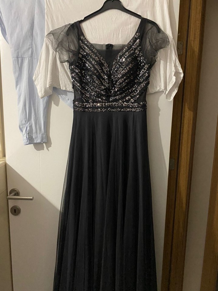 Siyah renkli, drapeli ve nakış işlemeli uzun abiye elbise. V yaka ve kısa kolludur, klasik gotik şıklığı yansıtır. Düğün için uygundur.