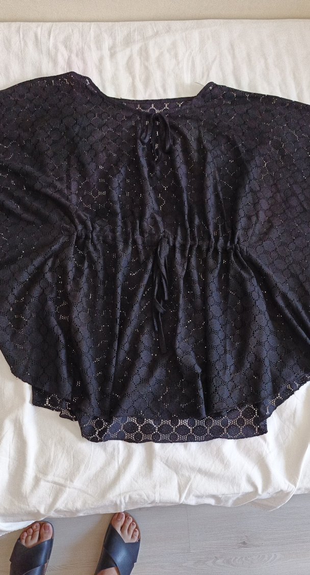 Drapeli siyah Pareo, V yaka ve askılı kollara sahiptir. Gevşek kesimi ve nakışlı deseniyle gotik ve bohem tarzları birleştirir.