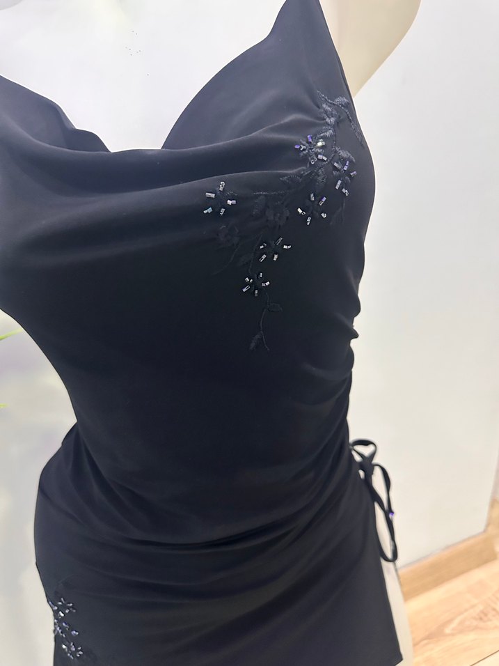 Drapeli ve işlemeli desenlere sahip, straplez yaka ve kolsuz, siyah üst Gotik tarzda, düğünler için uygun.