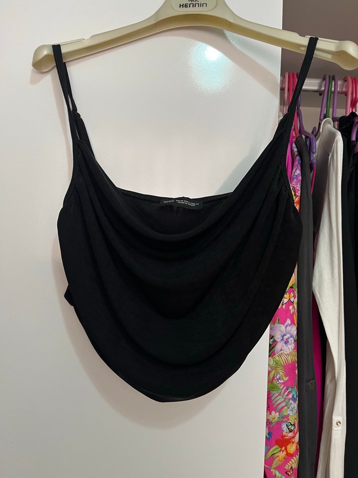 Siyah renkli, drapeli straplez büstiyer. Yumuşak sentetik kumaştan, bol kesim ve bağlamalı askılarla, batik desenli, midi boyda günlük kullanıma uygun.
