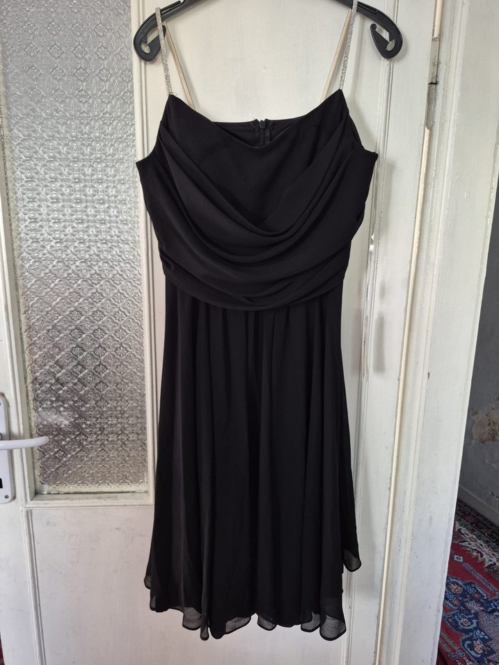 Siyah, straplez, drapeli ve midi boyda bu dar kesim gece elbisesi, romantik akşamlar için uygundur. Kolsuz ve desensizdir.