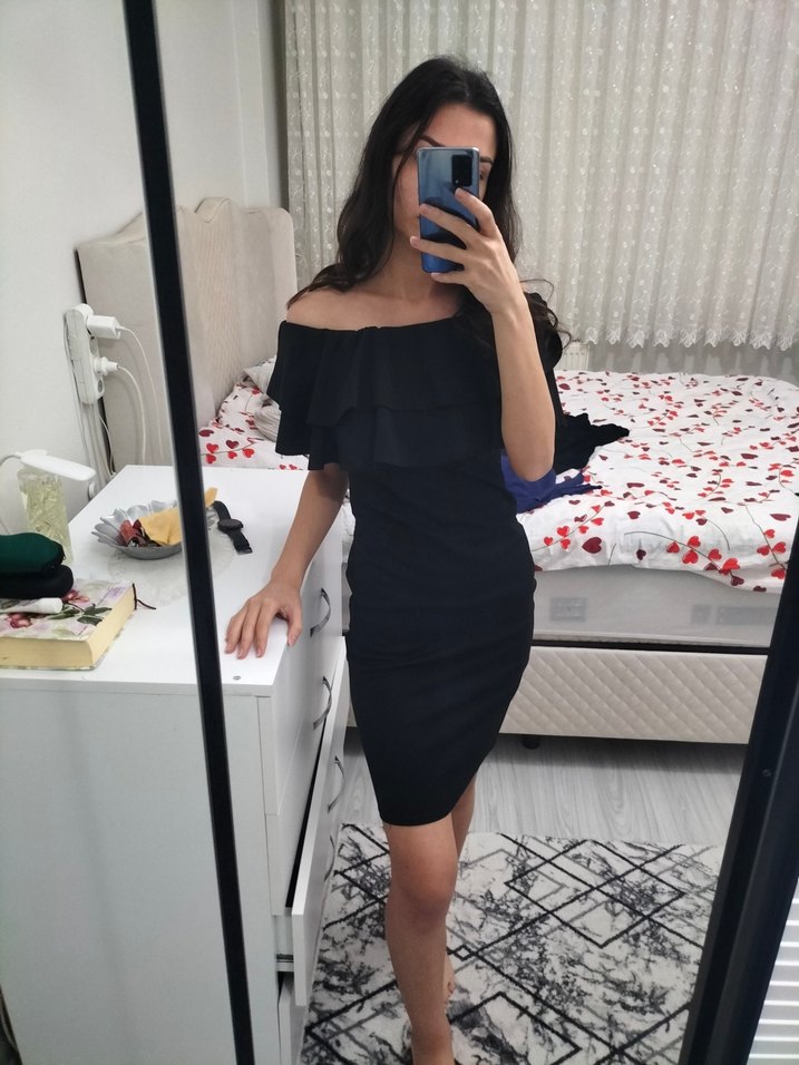 Drapeli detaylı, straplez yaka ve kısa kollu siyah mini elbise, herkesin dolabında olması gereken kurtarıcı elbise