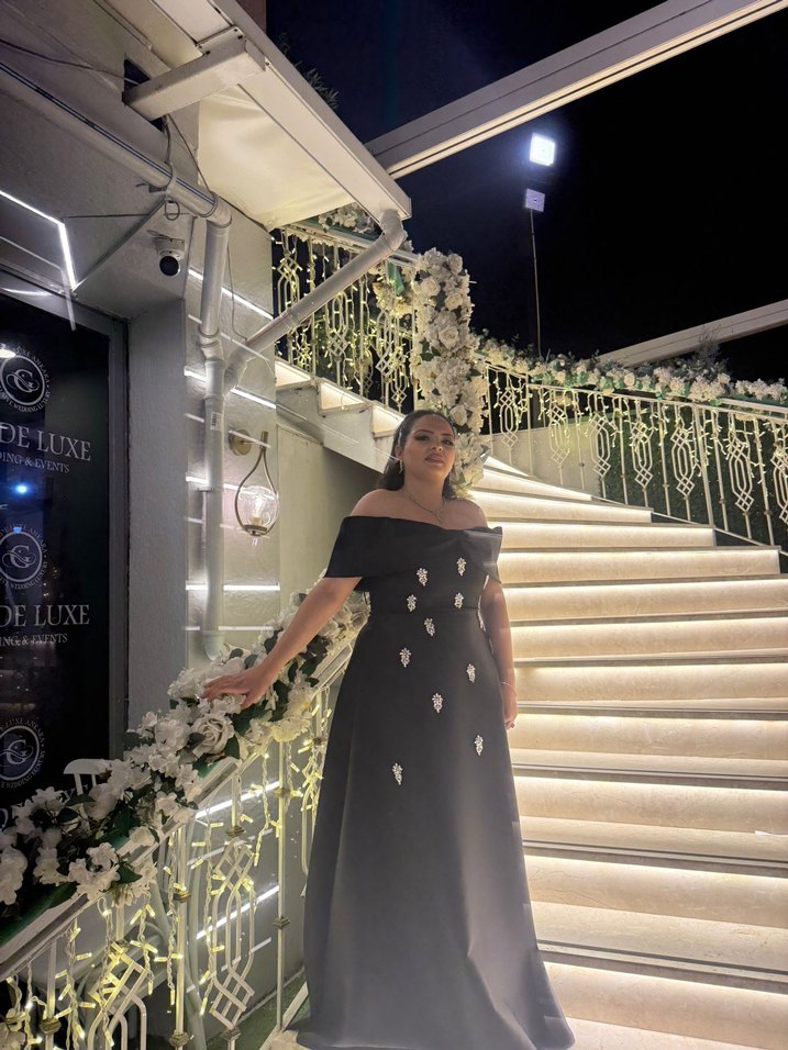 Siyah kayık yaka uzun abiye, drapeli detaylar ve nakışlı desenlerle klasik ve avangart gotik şıklık sunar. Vücut hatlarını belli etmez. kuzenimin düğünü için almıştım. Bir daha giymeyeceğim için satıyorum