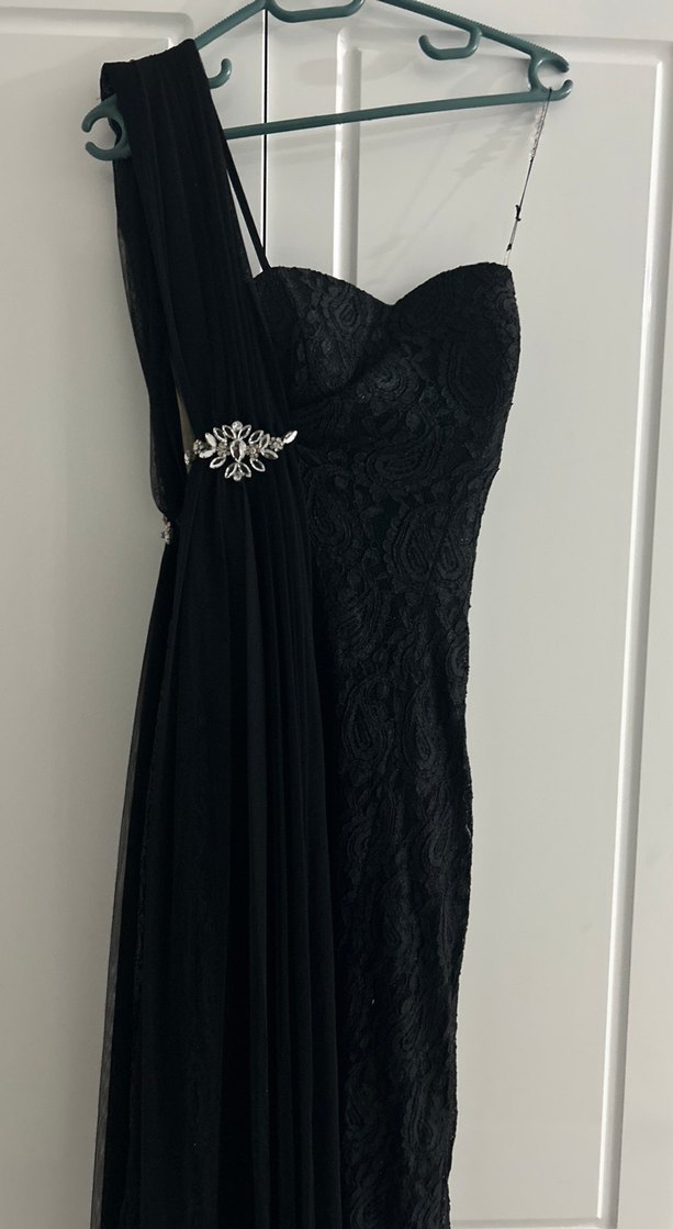 Siyah, straplez ve drapeli detaylı, vücuda oturan uzun abiye elbise. Desenli kumaşı ve zarif broş süsüyle gotik tarzda, düğün için uygun.
