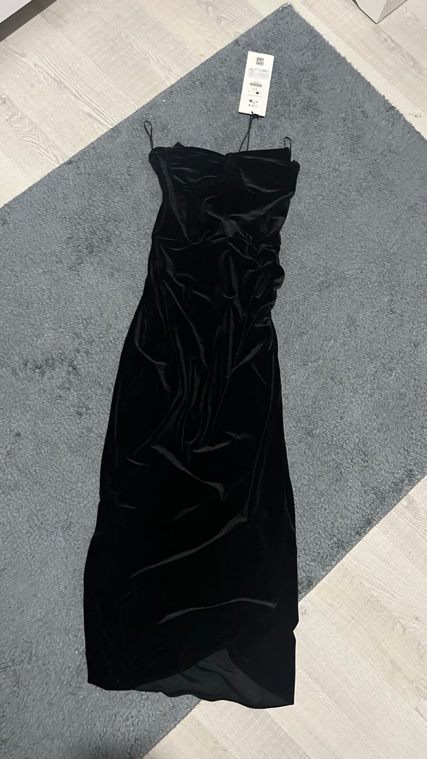 Drapeli, straplez uzun elbise, siyah ve sentetik kumaştan. Gotik tarzı yansıtır, şık ve romantik anlar için uygundur.
