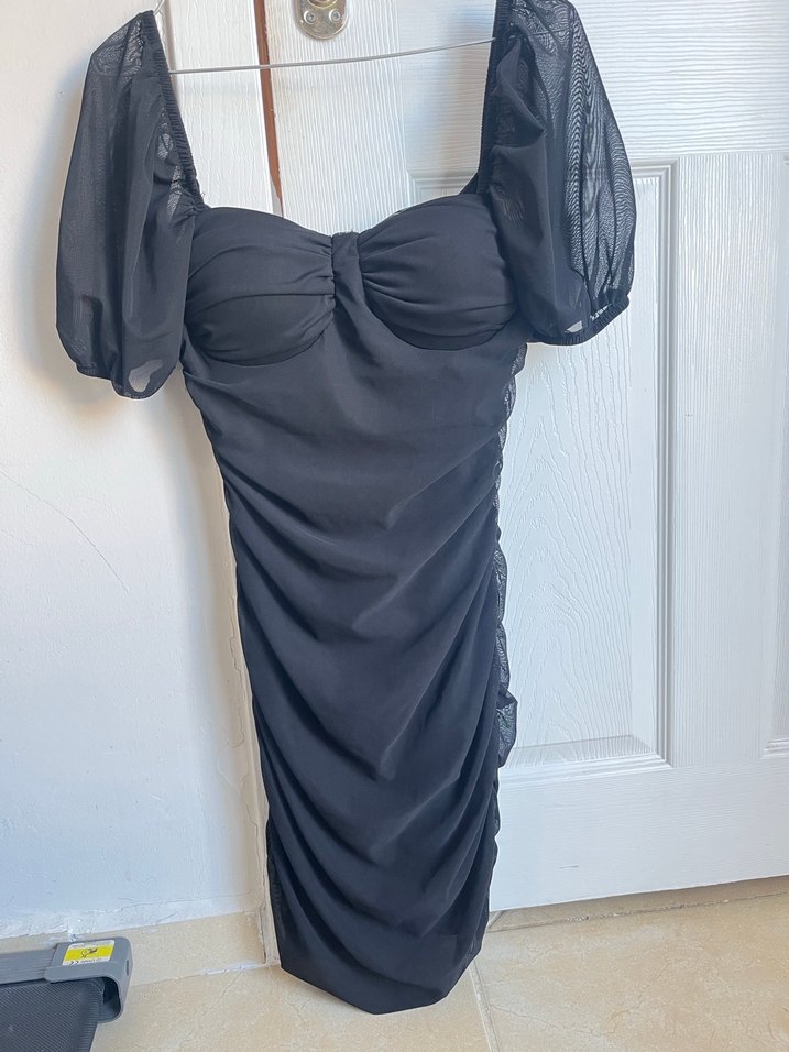 Siyah, straplez yakalı, drapeli ve dar kesim uzun elbise. Transparan askılı kollarıyla gotik ve cesur bir tarz sunar.