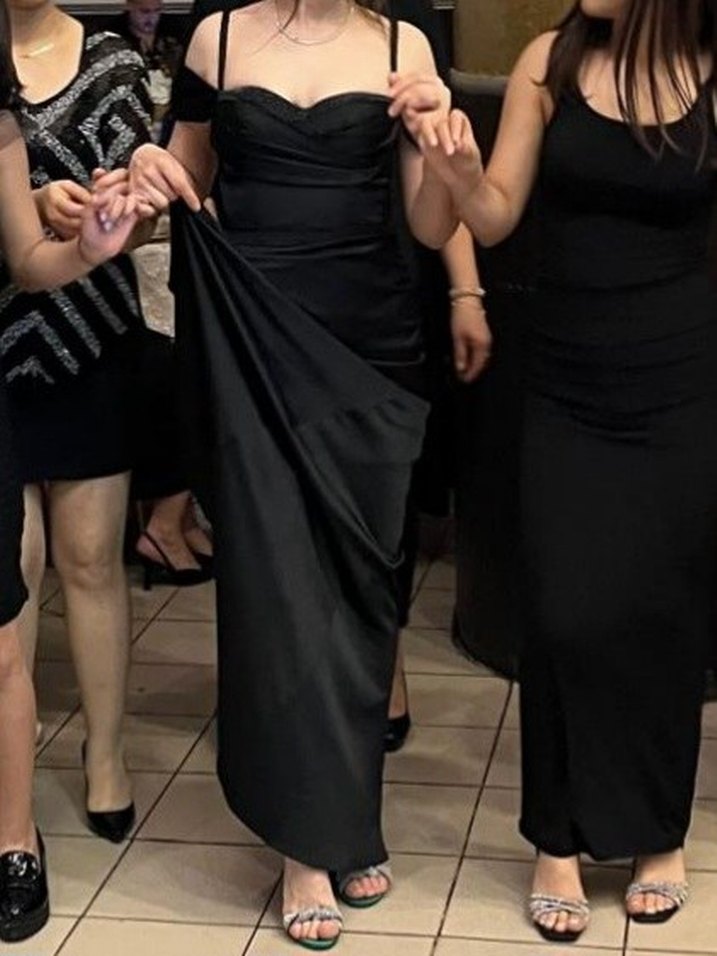 Bu siyah abiye elbise, straplez yakası, drapeli detayları ve askılı kollarıyla fitted kesim sunar. Siyah balık model saten elbise yırtmaçlı yan kısımları straplez parti elbisesi. düğün elbisesi. kina elbisesi. gece elbisesi için uygundur.