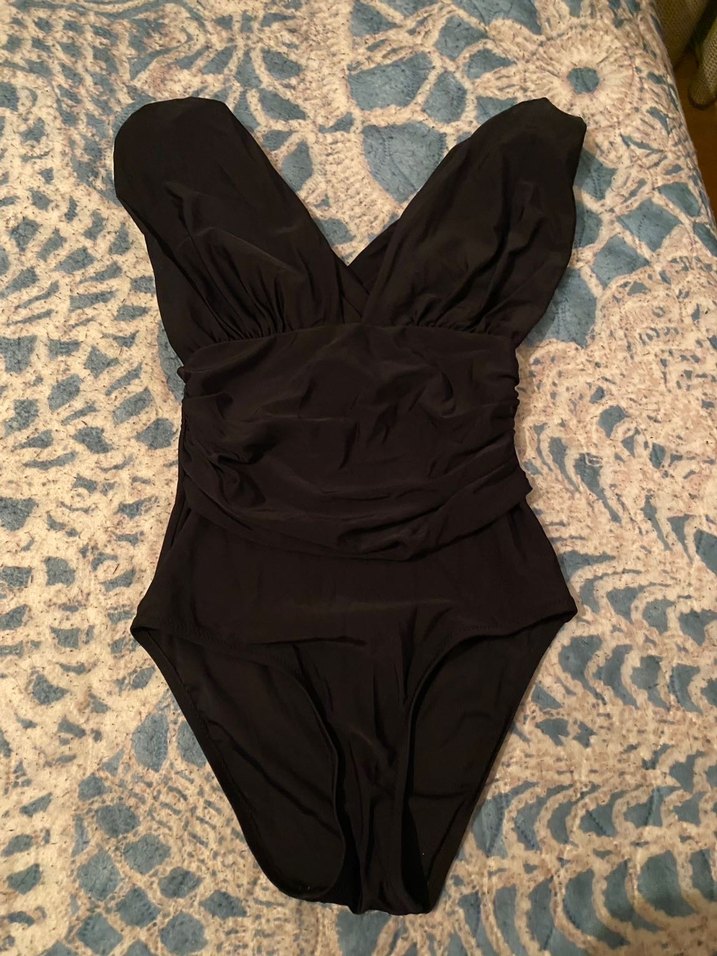Strappy askılı, drapeli siyah kadın mayo. Midi boyda, goth tarzında ve plaj için uygun, vücuda oturan kesime sahiptir.