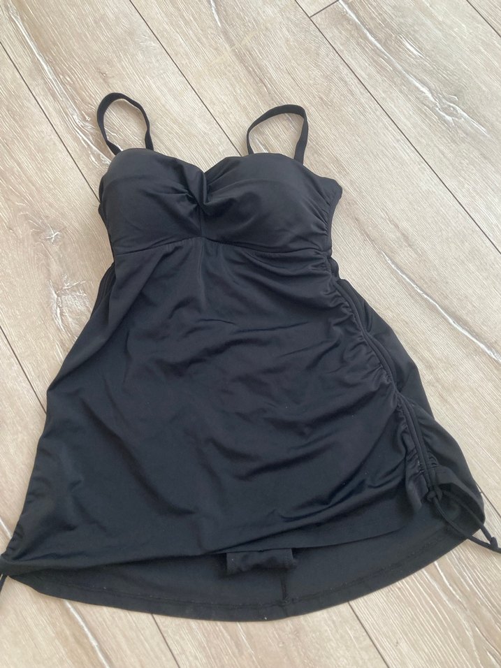 Drapeli tasarıma sahip, siyah renkli, strappy askılı ve midi boyda, vücuda oturan cesur goth tarzı mayo. Plaj için uygun.