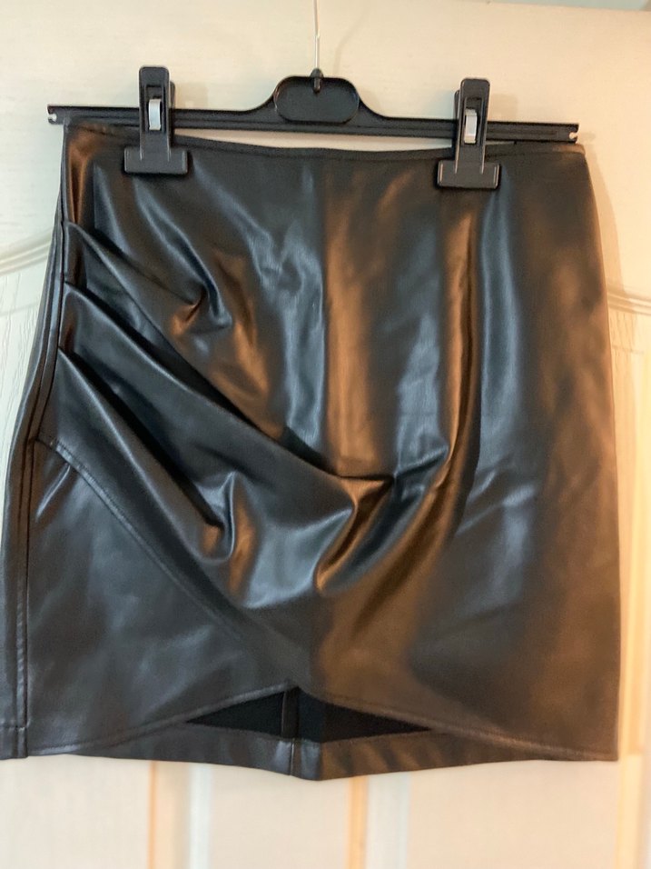 Drapeli siyah deri mini etek, dar kesim ve Paris tarzı gotik görünüm sunar. Ofis kullanımı için uygundur.