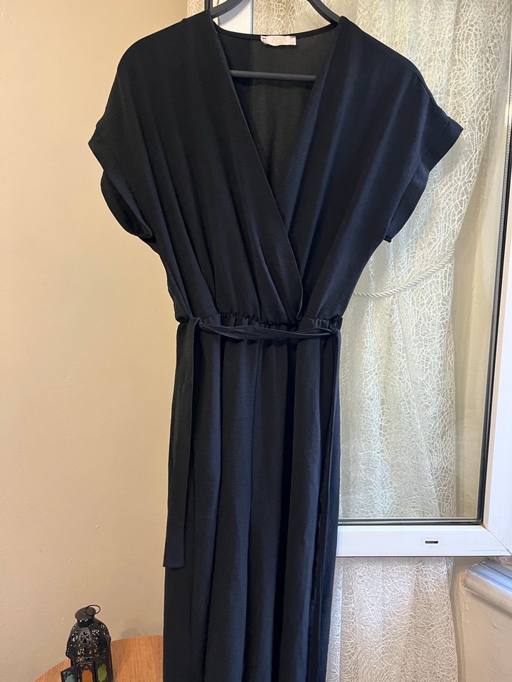 Drapeli, V yaka ve askılı kollara sahip uzun siyah tulum