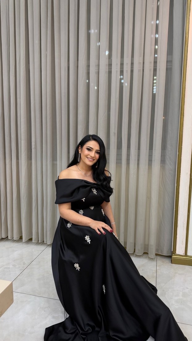 Bu siyah straplez abiye elbise, drapeli tasarımı, kısa kollu ve nakış detaylarıyla dikkat çekiyor. Düzenli kesim ve parlak yüzeyiyle düğünler için klasik gotik şıklık sunar. Beden olarak bir beden büyük aldım normalde 40 giyiyorum