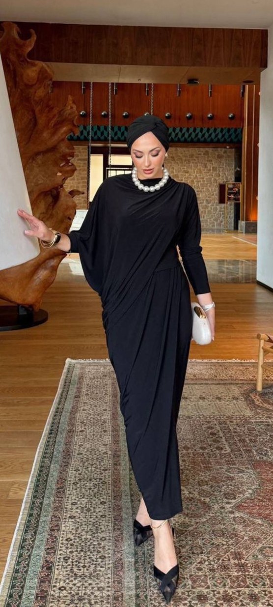 Siyah uzun abiye elbise, yüksek yakalı ve uzun kollu, bol ve drapeli kesimiyle mütevazı ve çağdaş bir stil sunar. Günlük kullanıma uygundur.