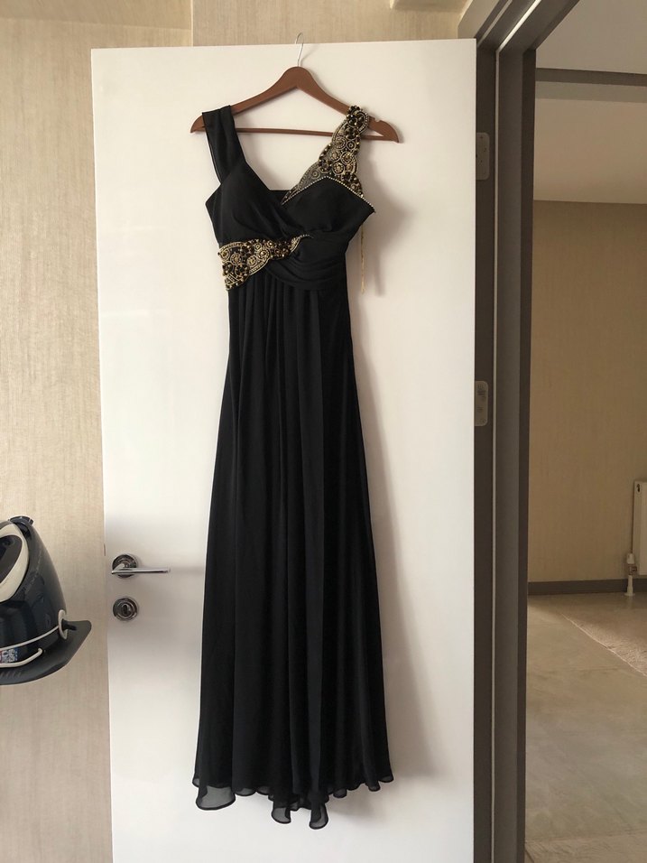 Drapeli ve desenli detaylara sahip, V yakalı ve kolsuz, siyah uzun abiye elbise, klasik ve şık bir görünüm sunar. 1 gece giyildi sadece. Kol detayı sonradan eklendi çıkarılabilir askılı formata geri döner