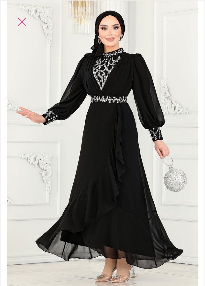 Bu siyah uzun abiye elbise, yüksek yakalı ve uzun kolludur. İşlemeli detayları ve drapeli tasarımıyla rahat ve şık bir görünüm sunar. Temiz sadece bir kez giyildi defosu yok