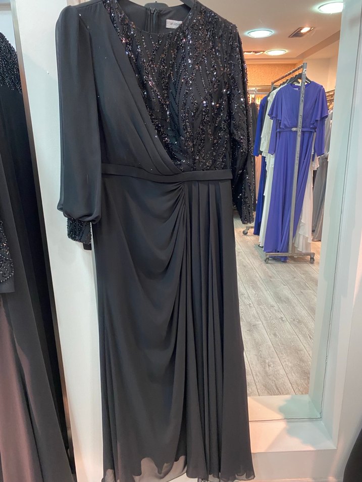 Bu siyah uzun abiye elbise, drapeli tasarımı, V yakası ve uzun kolları ile dikkat çeker. Payet işlemeli desenli üst kısmı ve klasik kesimiyle düğünlere uygundur. ✨firma ürünü etiketli 48 /50 beden uyumlu