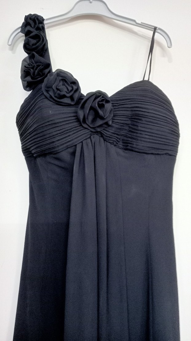 Drapeli detaylar ve omuzda çiçek süslemeleri bulunan, straplez ve vücuda oturan siyah uzun abiye elbise.