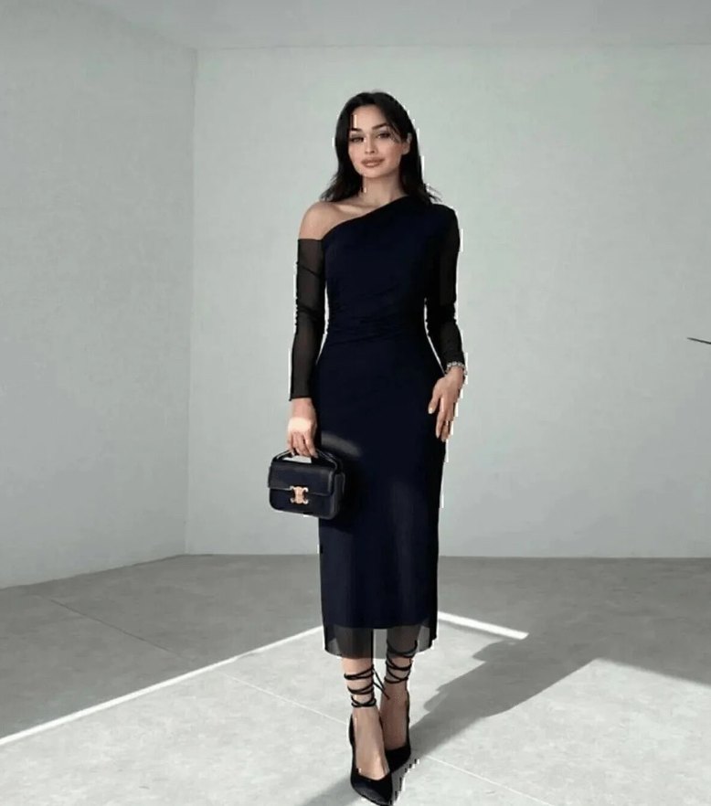 Drapeli tasarıma sahip, askılı kolları ve straplez yakasıyla siyah uzun elbise. Sentetik kumaştan, ofis için uygun regular fit.