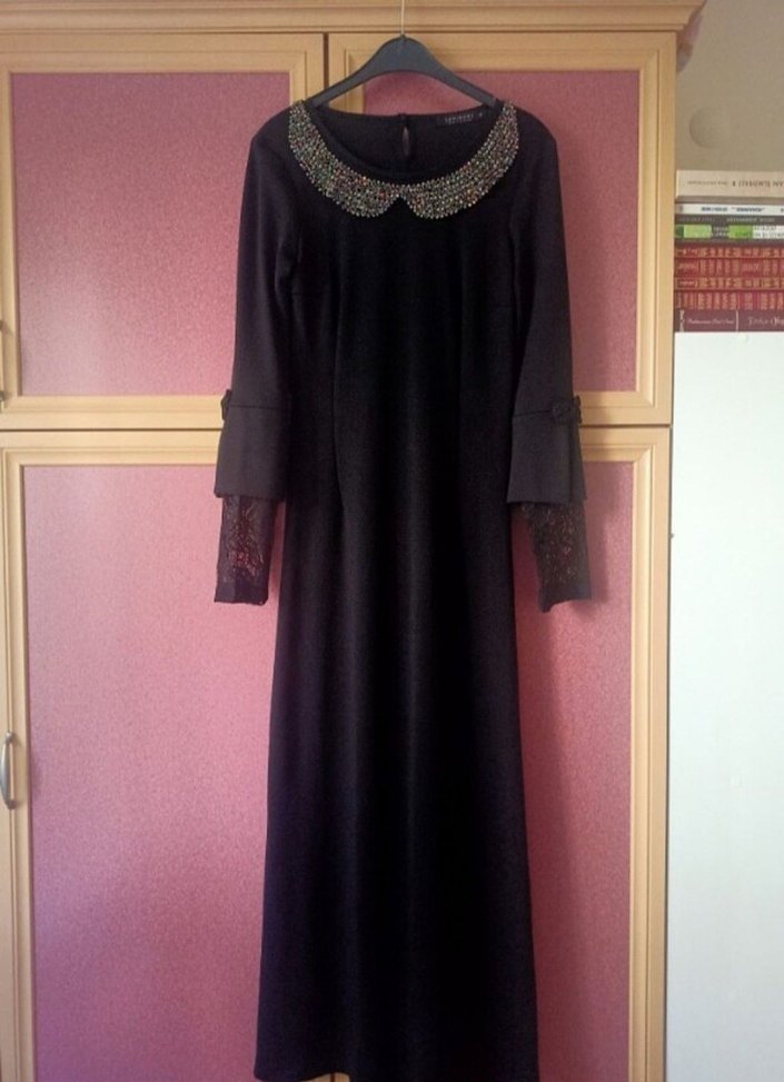 Drapeli tasarıma sahip siyah uzun elbise, nakış detayları ve kayık yaka ile klasik şıklık sunar. Dantel detaylı uzun kolludur. Abiye olarak kullanılabilir.
