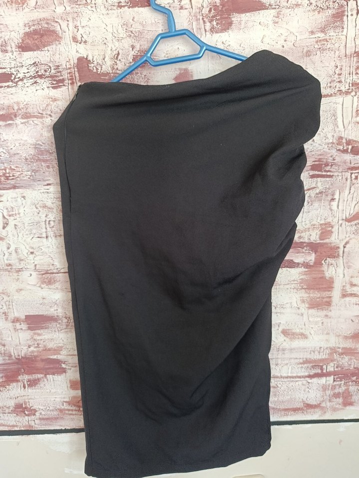 Drapeli, siyah, uzun ve dar kesim eteği, sentetik kumaştan üretilmiştir. Sokak modasına uygun, dış mekan kullanımı için idealdir.