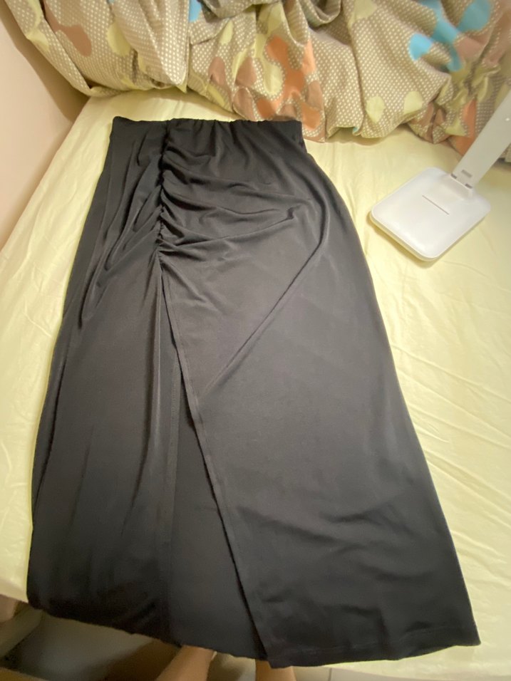 Drapeli tasarıma sahip, sıkı kesim siyah uzun etek, yumuşak sentetik kumaştan üretilmiştir, minimalist goth stiline uygundur.