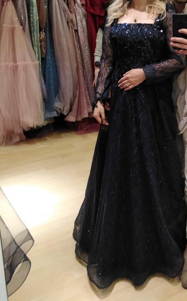Drapeli, uzun kollu ve tekne yaka detaylı, desenli siyah, vücuda oturan gotik uzun abiye elbise.
