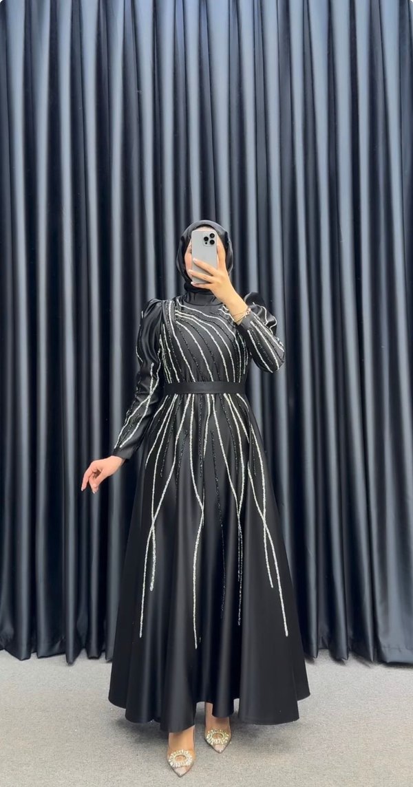 Drapeli detaylara sahip siyah uzun gotik elbise, yüksek yakalı ve nakışlıdır. Sade, düzenli kesim ve askılı kolludur, günlük kullanıma uygundur. ŞAL İLE BERABER GÖNDERİLECEKTİR