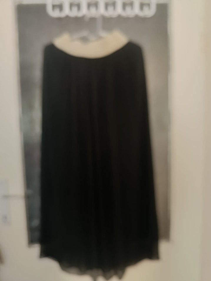 Drapeli detaylara sahip, siyah uzun etek, bol kesim ve yumuşak sentetik kumaştan. Gotik tarzda günlük kullanım için uygundur.