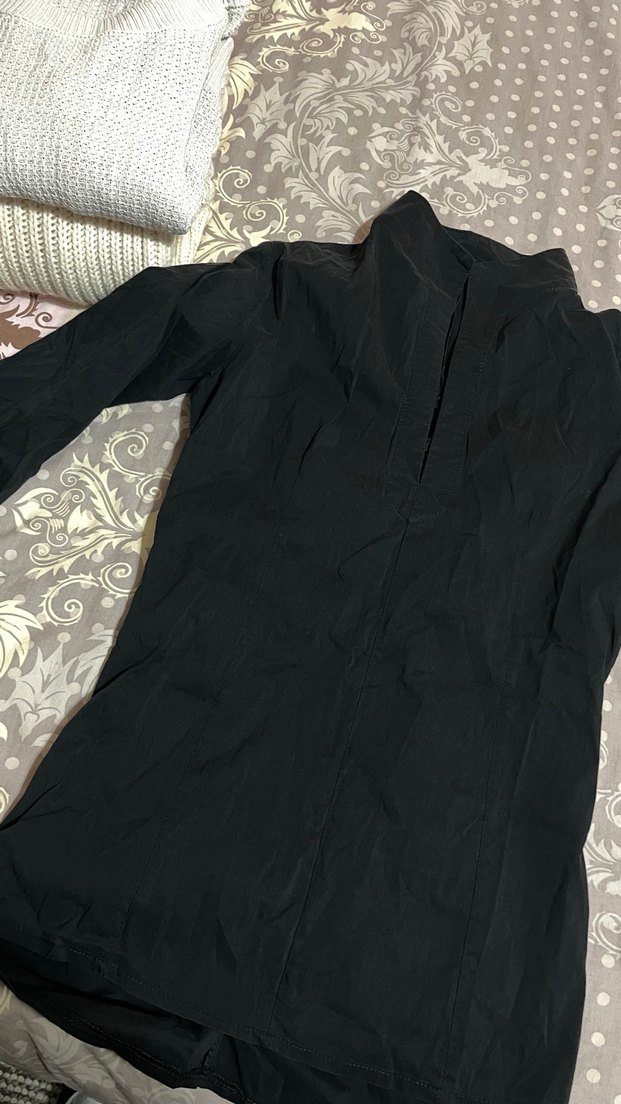 Drapeli tasarıma sahip, yüksek yakalı ve uzun kollu siyah hamile kabanı, yumuşak sentetik kumaştan üretilmiştir, avangart tarz için uygun.