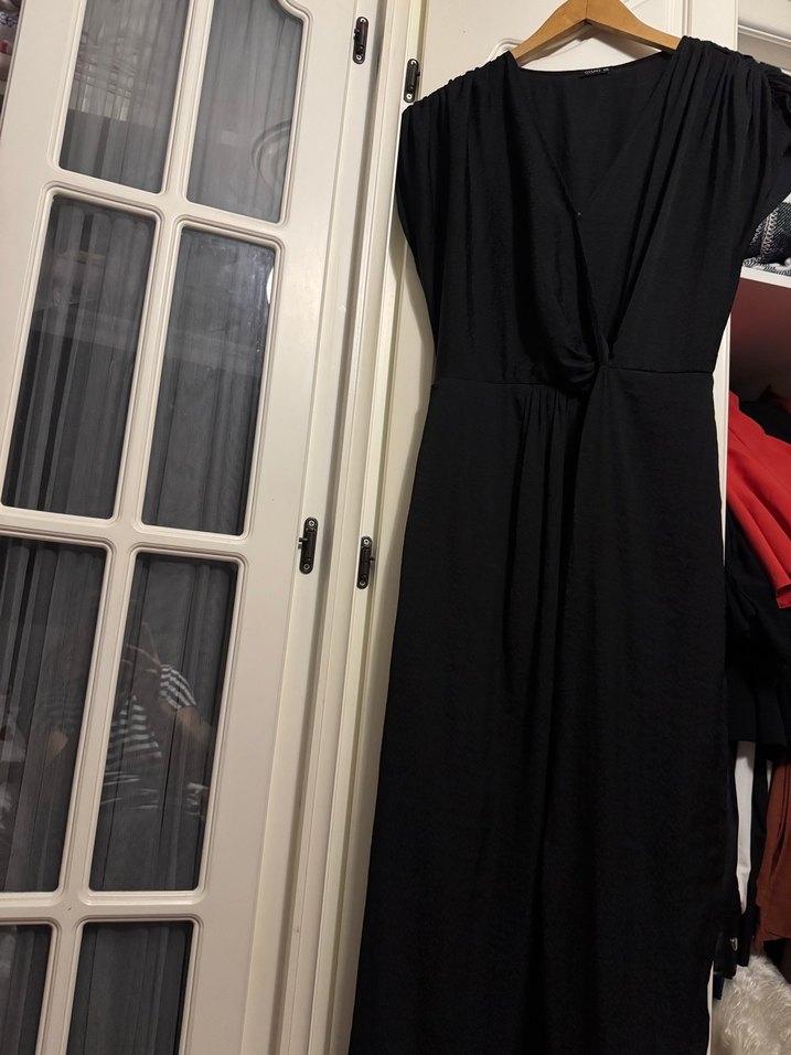 V yaka, kolsuz, drapeli ve siyah uzun, yumuşak sentetik kumaştan, şık ofis görünümü için uygundur. L bedenede uygundur