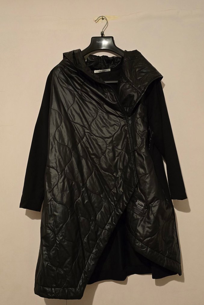 Drapeli tasarıma sahip siyah uzun ceket, yüksek yaka ve uzun kolludur. Rahat kesimi ve sentetik kumaşıyla günlük kullanıma uygundur.
