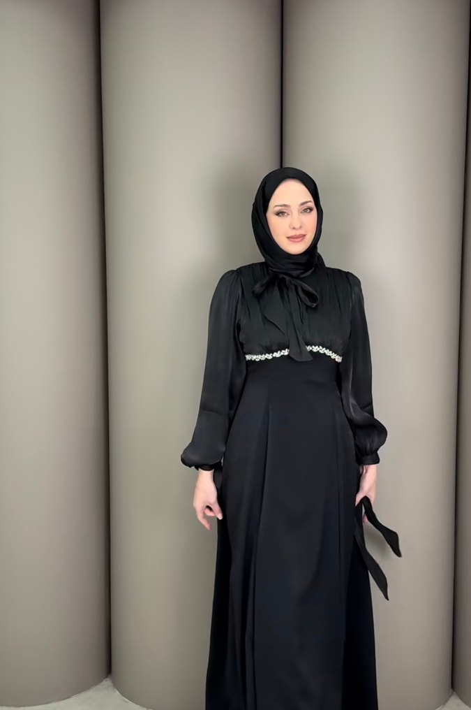 Siyah uzun elbise, yüksek yakalı ve uzun kolludur. Drapeli tasarımı ve regular kesimiyle ipeksi kumaştan üretilmiştir. Günlük kullanıma uygun, mütevazı ve gotik tarzda.