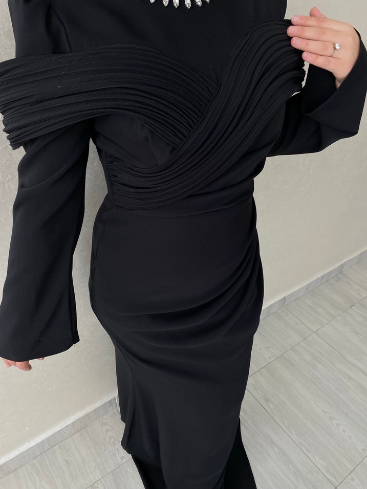 Drapeli Siyah Uzun Kadın Elbise