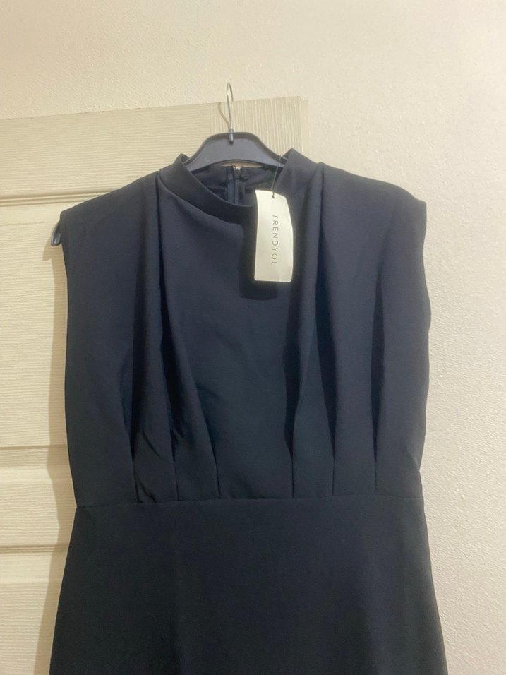 Yüksek yakalı, kolsuz ve drapeli detaylara sahip siyah uzun elbise, iş ortamı için uygun regular kesimle tasarlanmıştır.