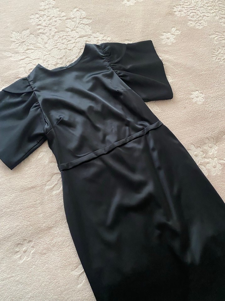 Siyah, drapeli, kısa kollu, yuvarlak yakalı, ince kesim, uzun elbise. İpek gibi kumaştan, minimalist gotik stile ve ofis kullanıma uygun.