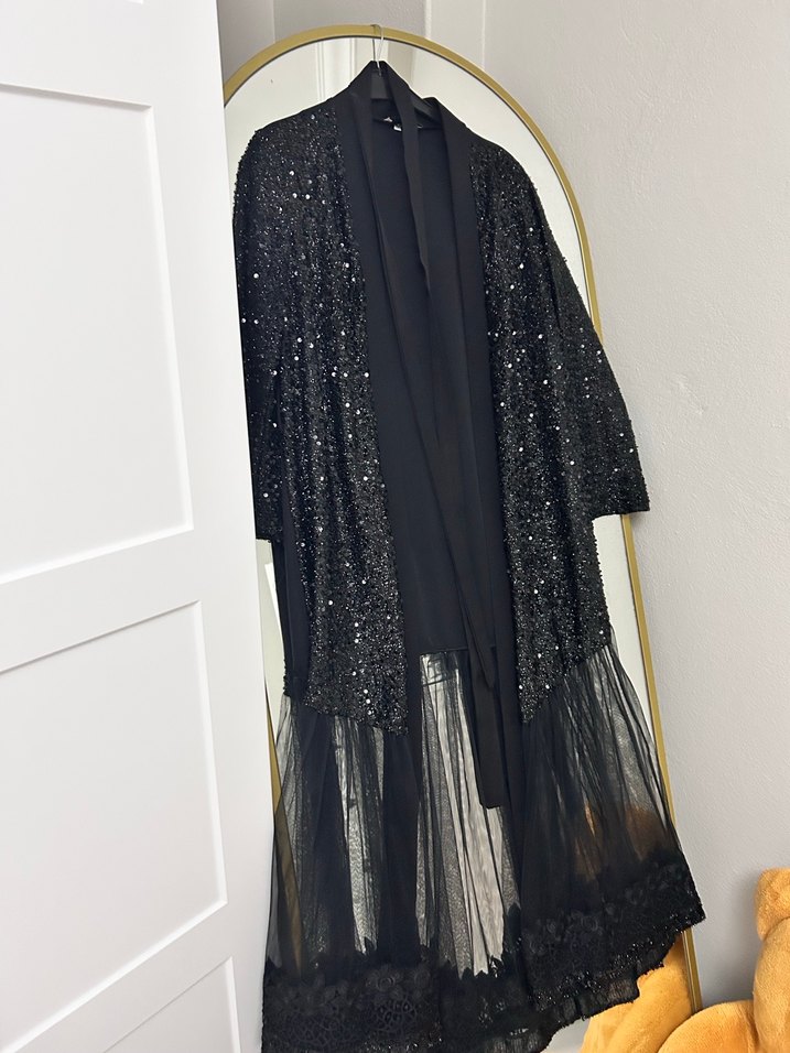 Drapeli, nakışlı detaylara sahip siyah uzun elbise. Notlu yaka, uzun kollu ve bol kesim ile gotik ve şık bir tarz sunar. Yumuşak sentetik kumaştan yapılmıştır. Standart beden