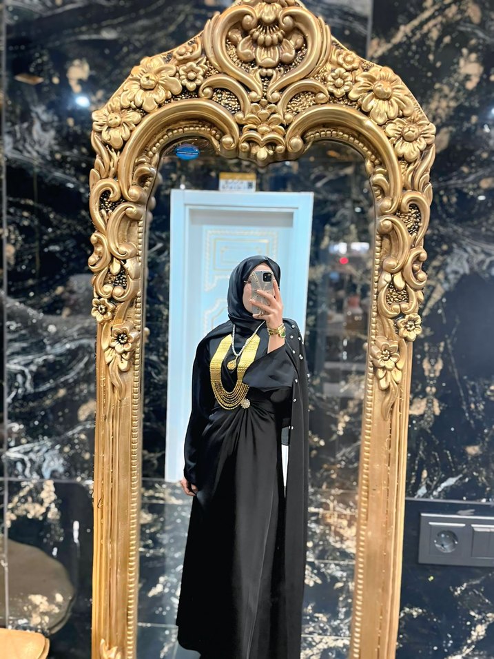 Siyah, uzun kollu, yüksek yakalı, drapeli ve etnik desenli, bol kesim, ipeksi dokulu uzun kadın elbisesi. Modest stil için uygundur. sadece bir saat giyildi
