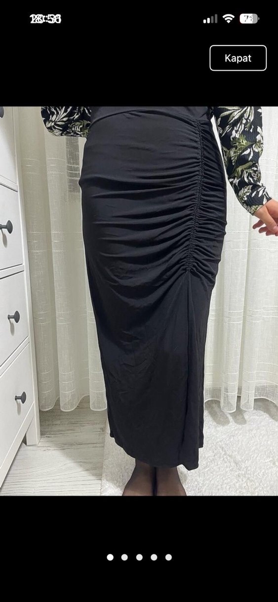 Sentetik kumaştan, drapeli tasarıma sahip siyah uzun etek. İnce tie-dye deseniyle günlük ve goth tarzlara uygundur.