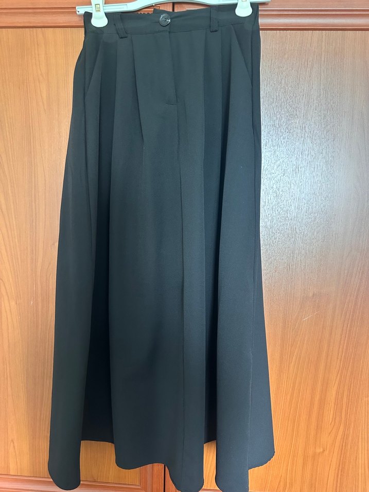 Drapeli siyah uzun etek, düz kesim ve sentetik kumaştan. İş ve ofis kullanımı için uygun, normcore tarzda.