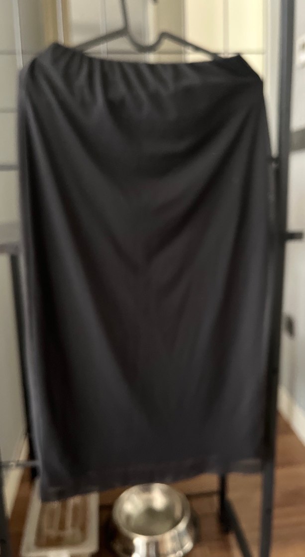 Siyah uzun etek, drapeli ve vücuda oturan kesime sahip, sentetik kumaştan üretilmiştir. Modest gotik tarzı yansıtır ve ofis kullanımı için uygundur. İçi penye dışı tül detaylı spor etek