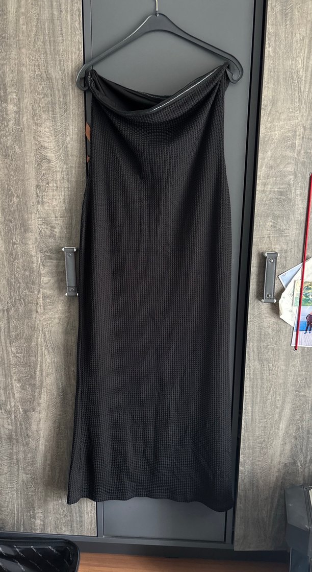 Drapeli tasarıma sahip, yumuşak sentetik kumaştan üretilmiş siyah uzun ve dar kesim etek. Minimalist sokak stiline uygun. Büyük beden elbise
