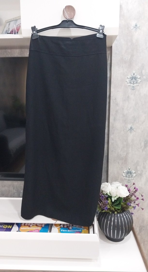Drapeli detaylara sahip, siyah uzun ve dar kesim kadın eteği. Düz ve pürüzsüz sentetik kumaştan üretilmiştir. Ofis için uygun, gotik tarzda şık bir parça.
