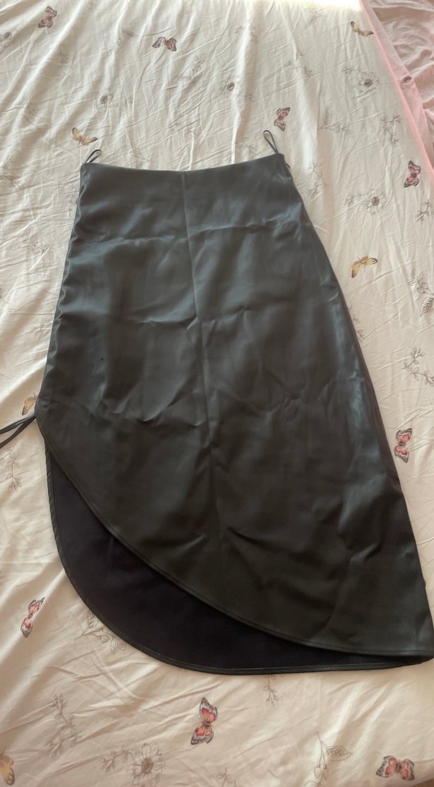 Drapeli tasarıma sahip, sentetik kumaştan yapılmış siyah uzun ve vücuda oturan etek, minimalist sokak stili için uygun. . Licrali suni deri. Yırtmacı ayarlanabiliyır. AMBAR marka
