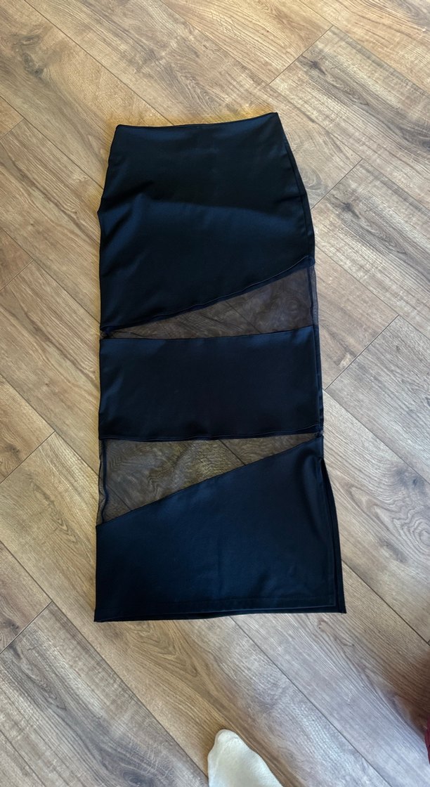 Drapeli detaylara ve şeffaf panellere sahip, sentetik kumaştan yapılmış siyah uzun, vücuda oturan etek.