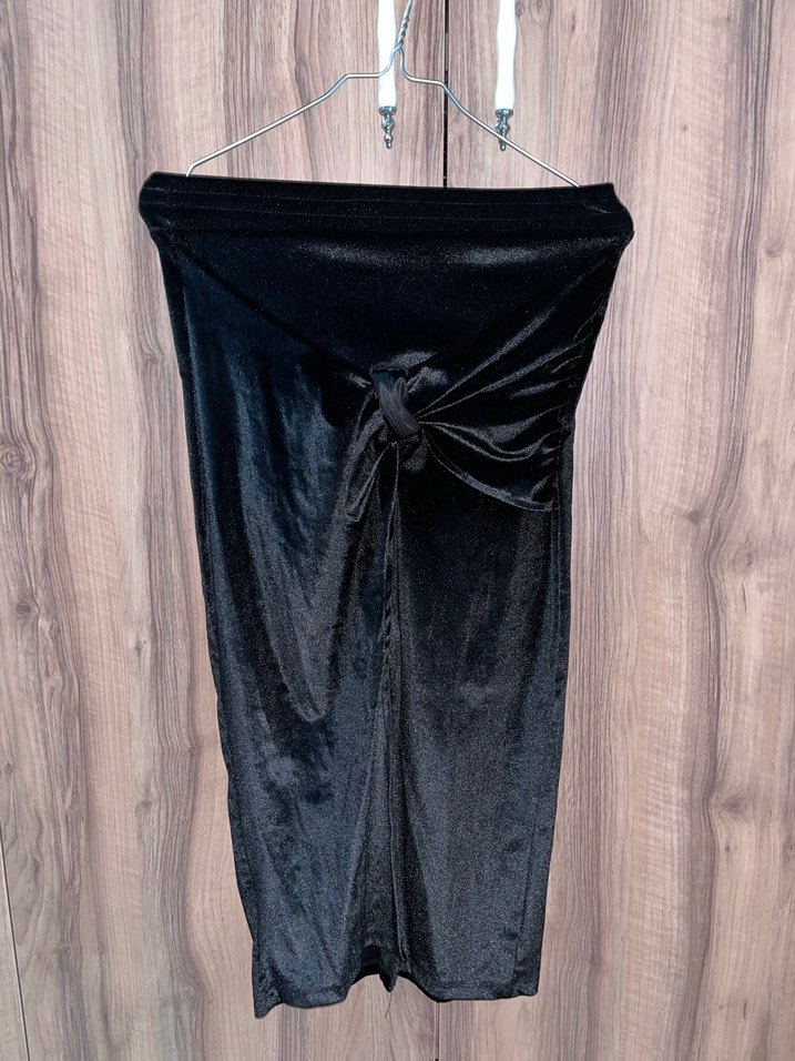 Drapeli ve düğüm detaylı, siyah uzun kadın eteği. Pürüzsüz kadife kumaştan, gotik tarzda romantik akşamlar için uygundur. Önden yırtmaçlıdır.