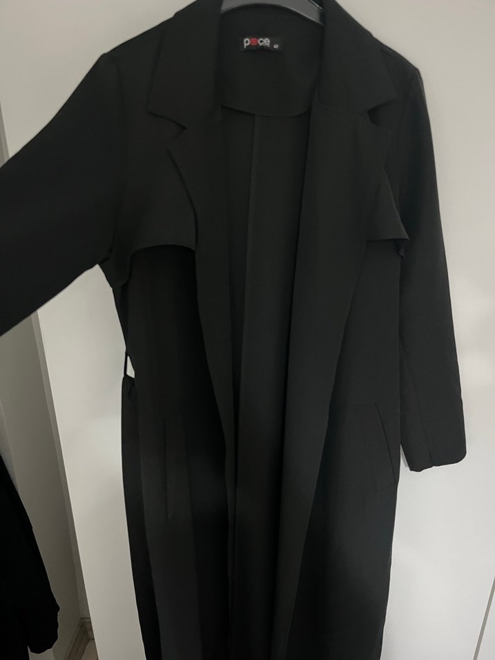 Drapeli tasarıma sahip siyah uzun kadın kaban, notched lapel yakalı ve uzun kolludur. Sentetik kumaştan üretilmiştir, ofis ve günlük kullanıma uygundur.