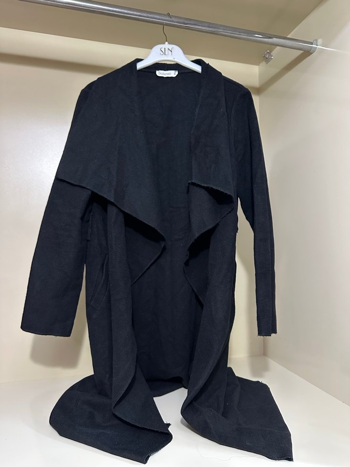 Siyah uzun keten kaban, drapeli tasarım, keskin yaka ve uzun kollu. Salaş kesim, minimal ve sokak modası tarzında, günlük kullanım için uygun.